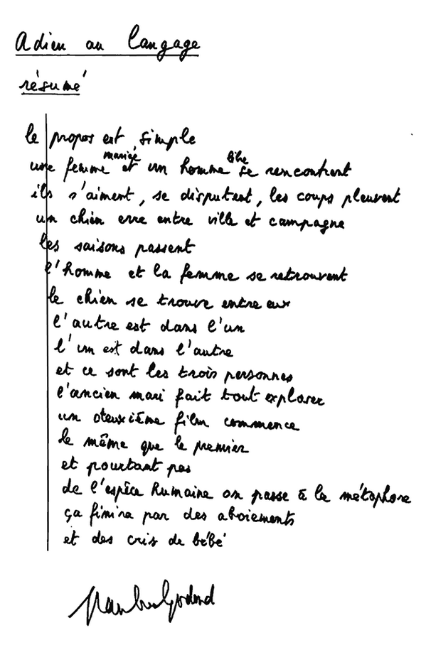 Adieu au langage Réalisation Jean-Luc Godard Production Wild Bunch Production (F) Fiction / 2014 / 70' Plus d’informations (Swiss Films)