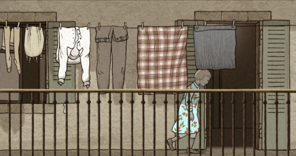 Ariane traverse le XX siècle, sa vie défile, montrée uniquement à travers le linge qu’elle suspend sur le balcon.