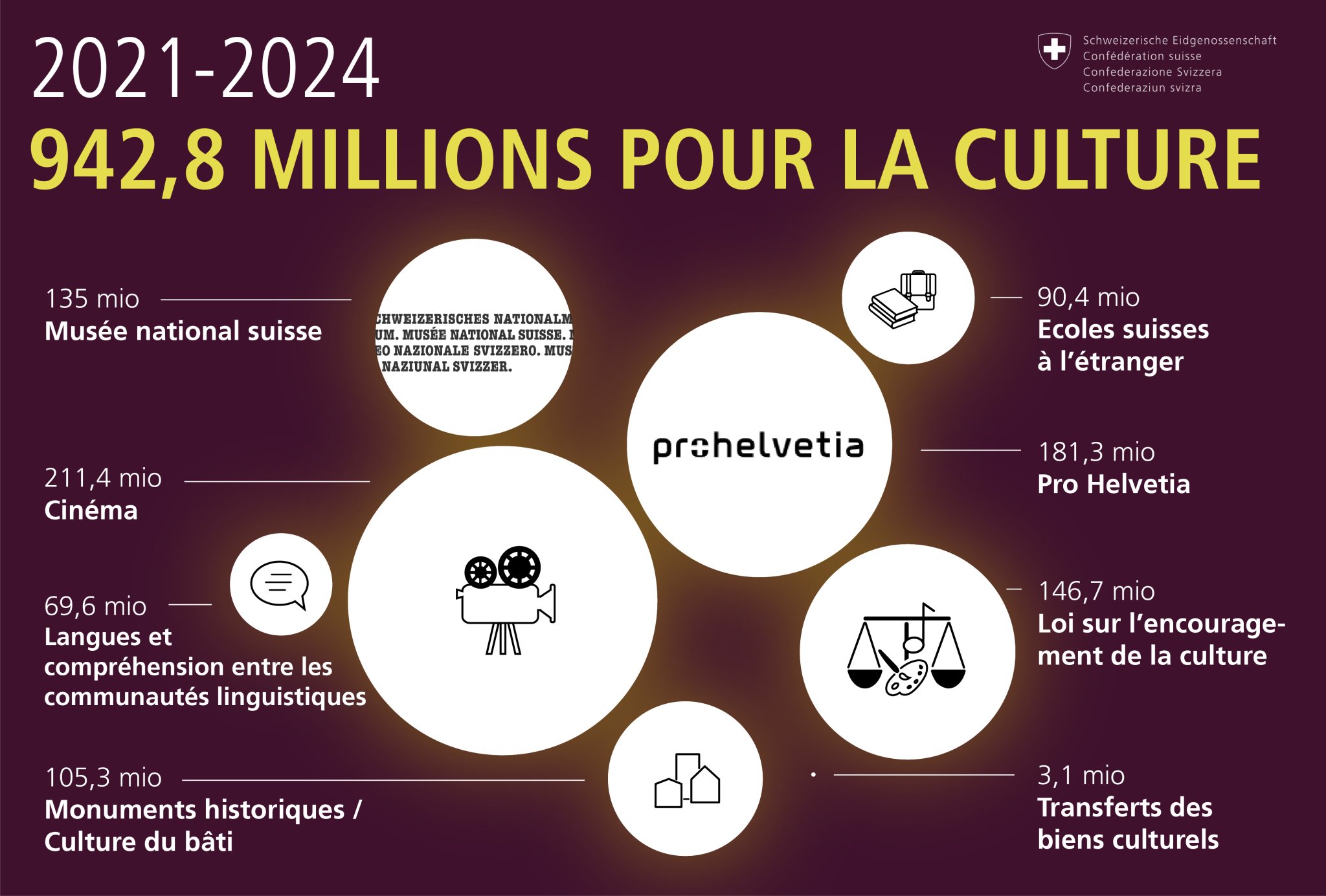 Le Conseil fédéral mise sur la continuité en matière de politique culturelle. Les trois axes d'action définis pour 2016-2020 - participation culturelle, cohésion sociale, création et innovation - sont maintenus pour la période 2021-2024. Certains domaines sont toutefois renforcés.